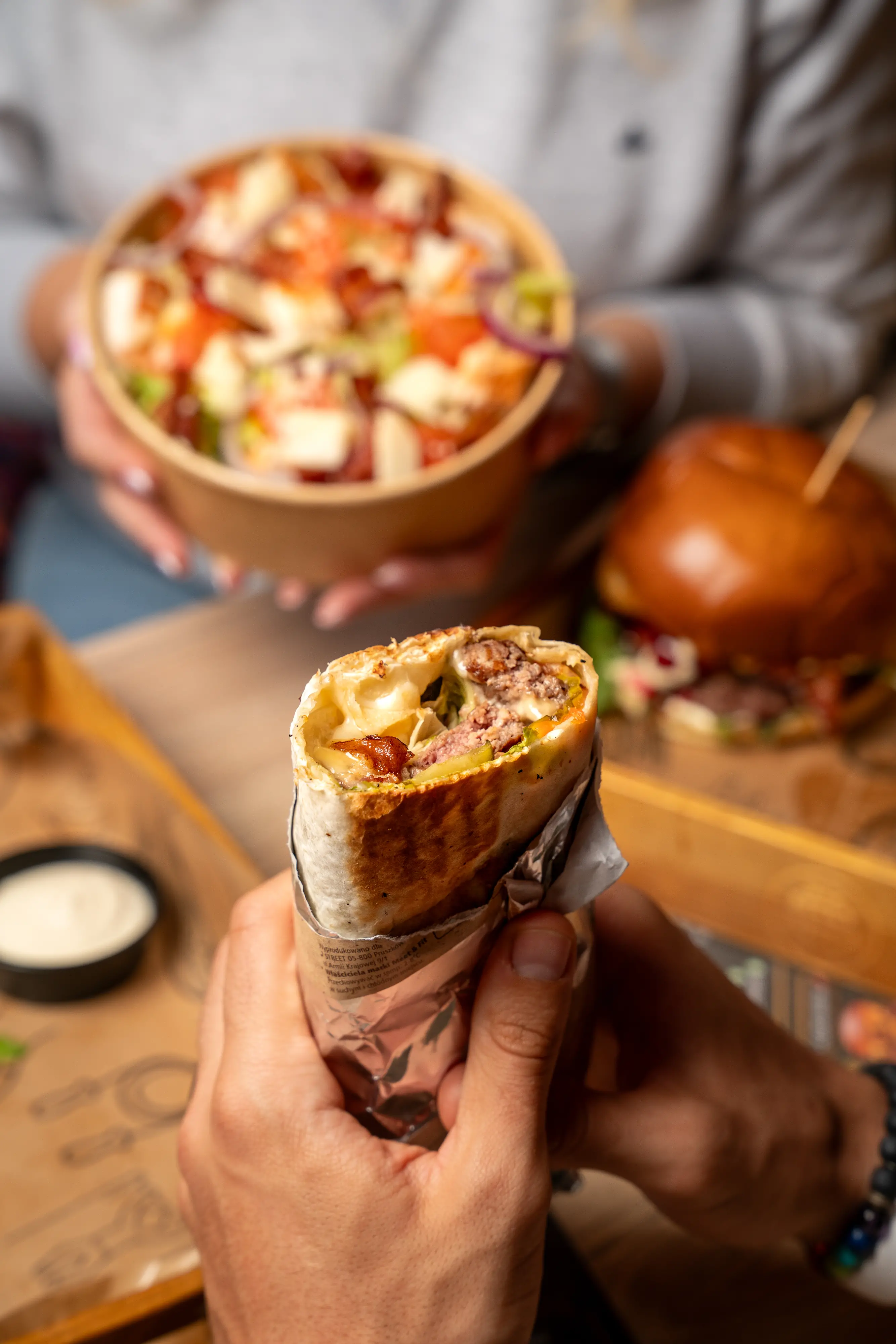 Dajemy też wybór. Każdego burgera możesz zamienić na wrapa albo sałatkę, jeśli masz ochotę na coś lżejszego albo po prostu wolisz inną formę.