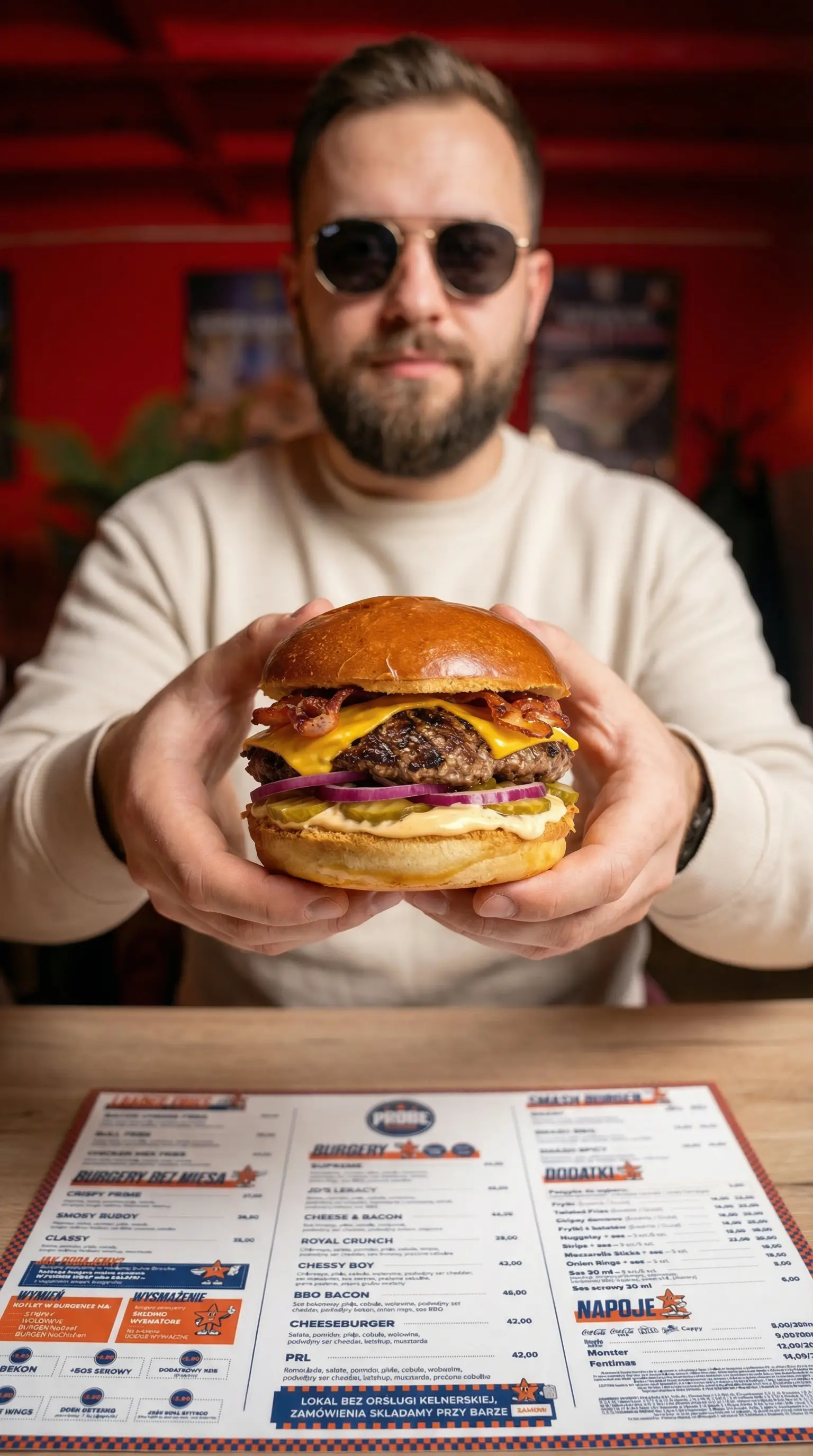 Przygotowujemy smash burgery i klasyczne burgery na sezonowanej wołowinie, dzięki czemu mięso ma pełniejszy, głębszy smak. Do tego używamy wypiekanej bułki maślanej brioche, a nasze sosy robimy sami, żeby każdy burger miał własny charakter i konkretny smak.